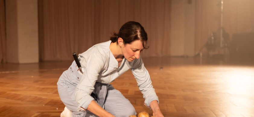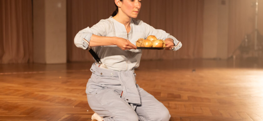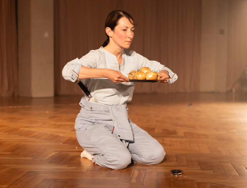 The solo performance Not I is a quiet, slow piece that guides us back to ordinary gestures – pouring a glass of wine, peeling an onion, the movement of fish. The body moves with precision and gentleness in a space where every detail has meaning. Mutel draws on Japanese tea ceremonies to create a scene that is not about her but about us all, about being with others while not hurrying, without pressures, and in true closeness.