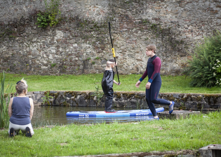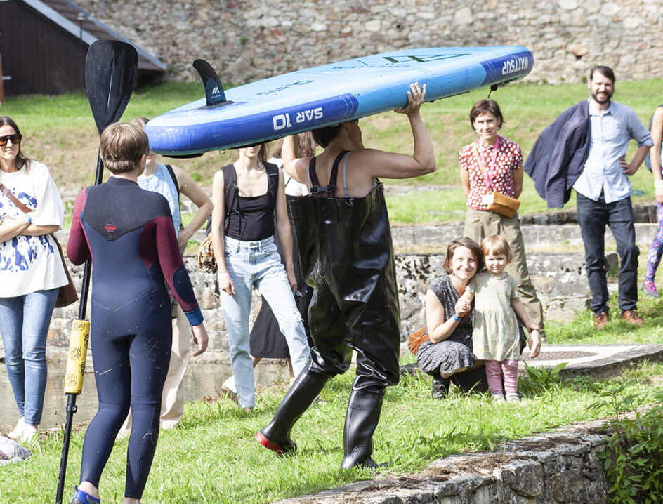 Niekedy je to aj o vyrušení, neplánovanom odklonení pozornosti diváka. Tu na rybníku na sádkach paddleboard naozaj nemá čo robiť – a možno práve táto – nazvime to honosne – priestorovo-materiálna deviácia spustí reflexiu, transformáciu. Môže byť súčasťou procesu, ktorý vedie k uvedomeniu.